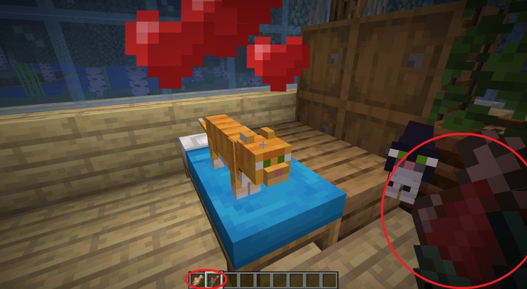 村や特定のバイオームでネコを2匹探します。タラやサケを用意しておきましょう。