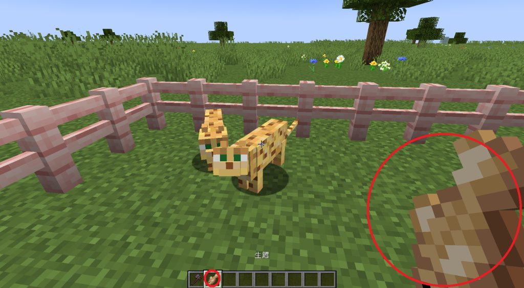 ジャングルバイオームで2匹のヤマネコを探します。生鱈や生鮭を用意しておきましょう。
