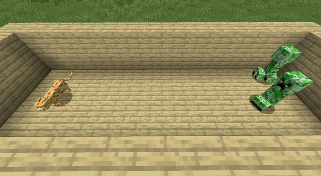 ネコの特性と同じで、ヤマネコが近くにいるとクリーパーが近寄ってきません。その距離は6ブロック分の距離です。プレイヤーがヤマネコから離れるとクリーパーが再度襲ってくるので注意が必要です。